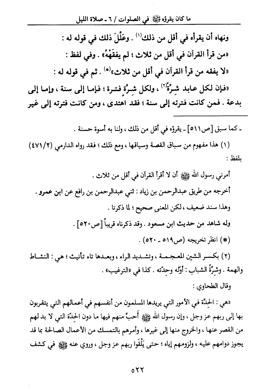" من قرأ القرآن في أقل من ثلاث؛ لم يفقَهْهُ ". وفي لفظ: