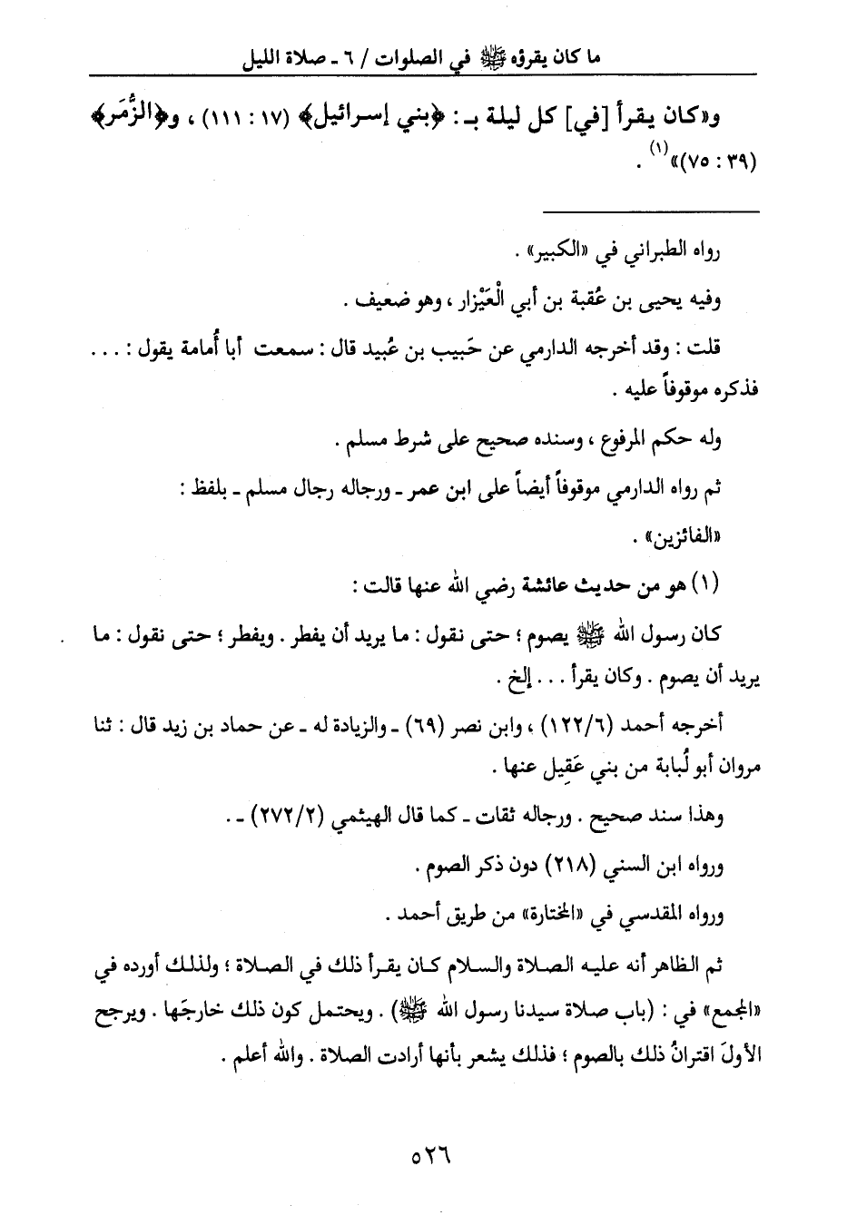 و " كان يقرأ [في] كل ليلة بـ: {بني إسرائيل} (17: 111) ، و {الزُّمَر}