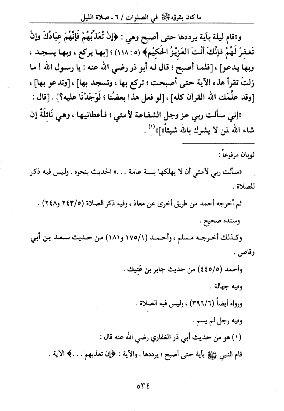 و " قام ليلة. بآية يرددها حتى أصبح وهي: {إِنْ تُعَذِّبْهُمْ فَإِنَّهُمْ عِبَادُكَ وَإِنْ