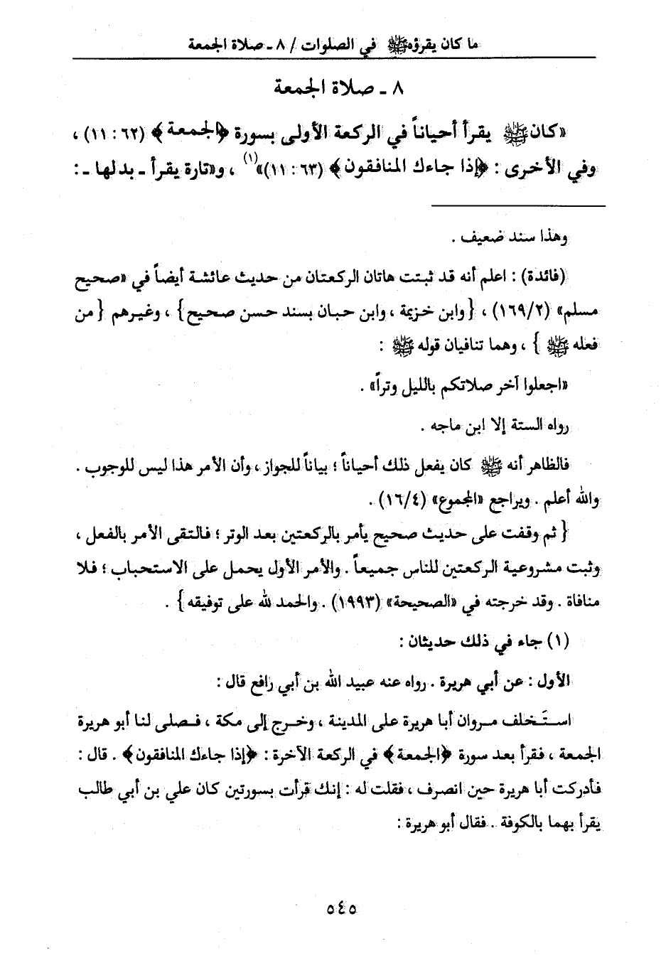 " كان صَلَّى اللَّهُ عَلَيْهِ وَسَلَّمَ يقرأ أحياناً في الركعة الأولى بسورة {الجُمُعَة} (62: 11) ،