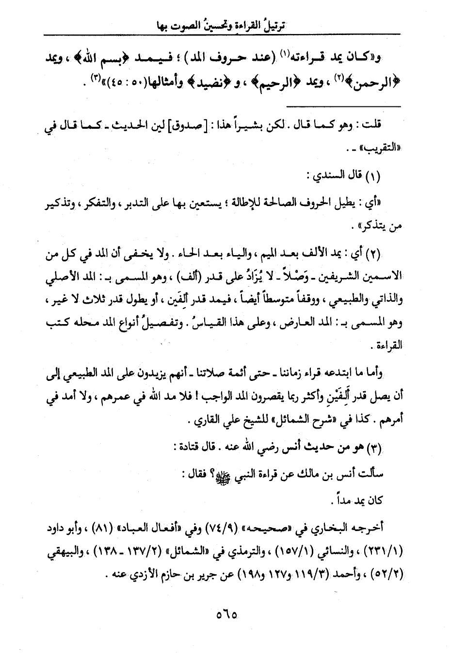و " كان يمد قراءته (1) (عند حروف المد) ؛ فيمد {بِسْمِ اللَّهِ} ، ويمد