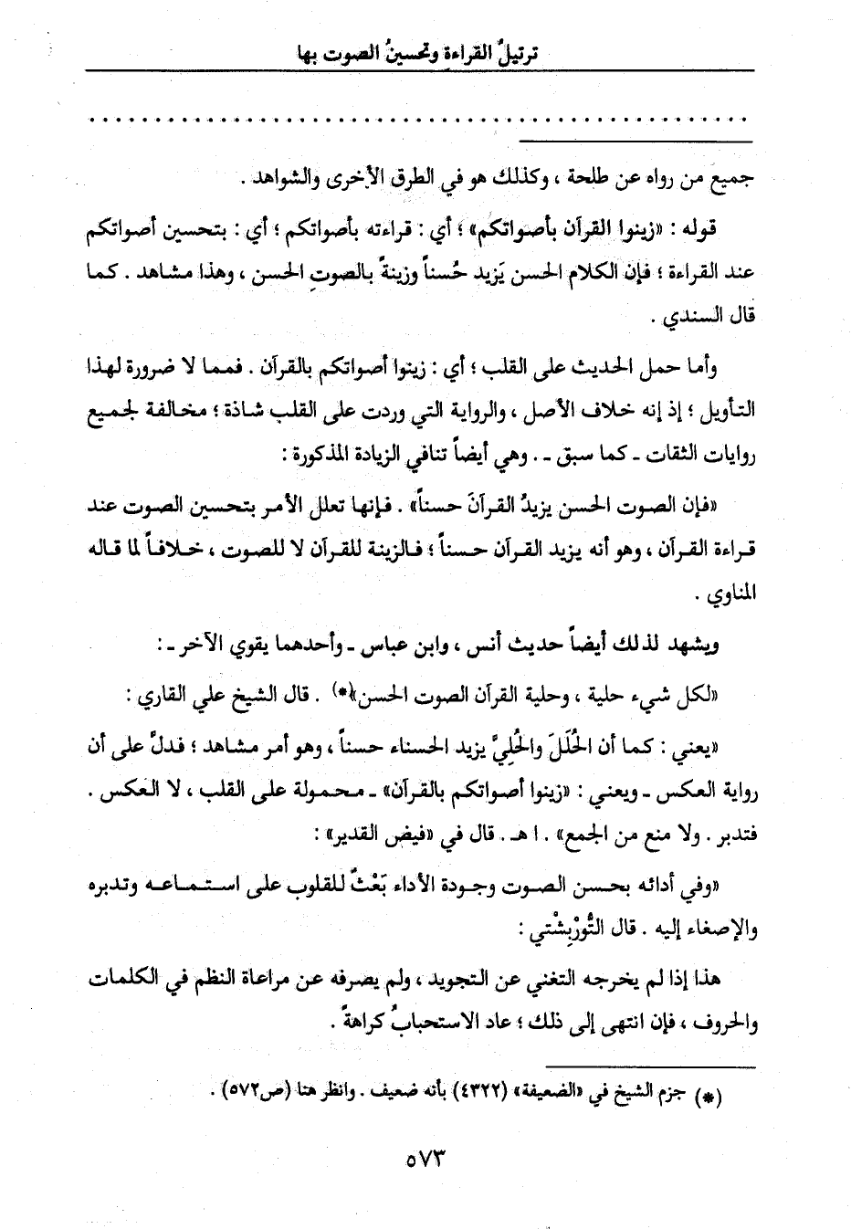 " لكل شيء حلية، وحلية القرآن الصوت الحسن " (*) . قال الشيخ علي القاري: