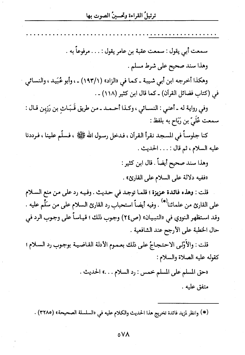 على القارئ من علمائنا (*) . وفيه أيضاً استحباب رد القارئ السلام على من سَلَّم عليه.