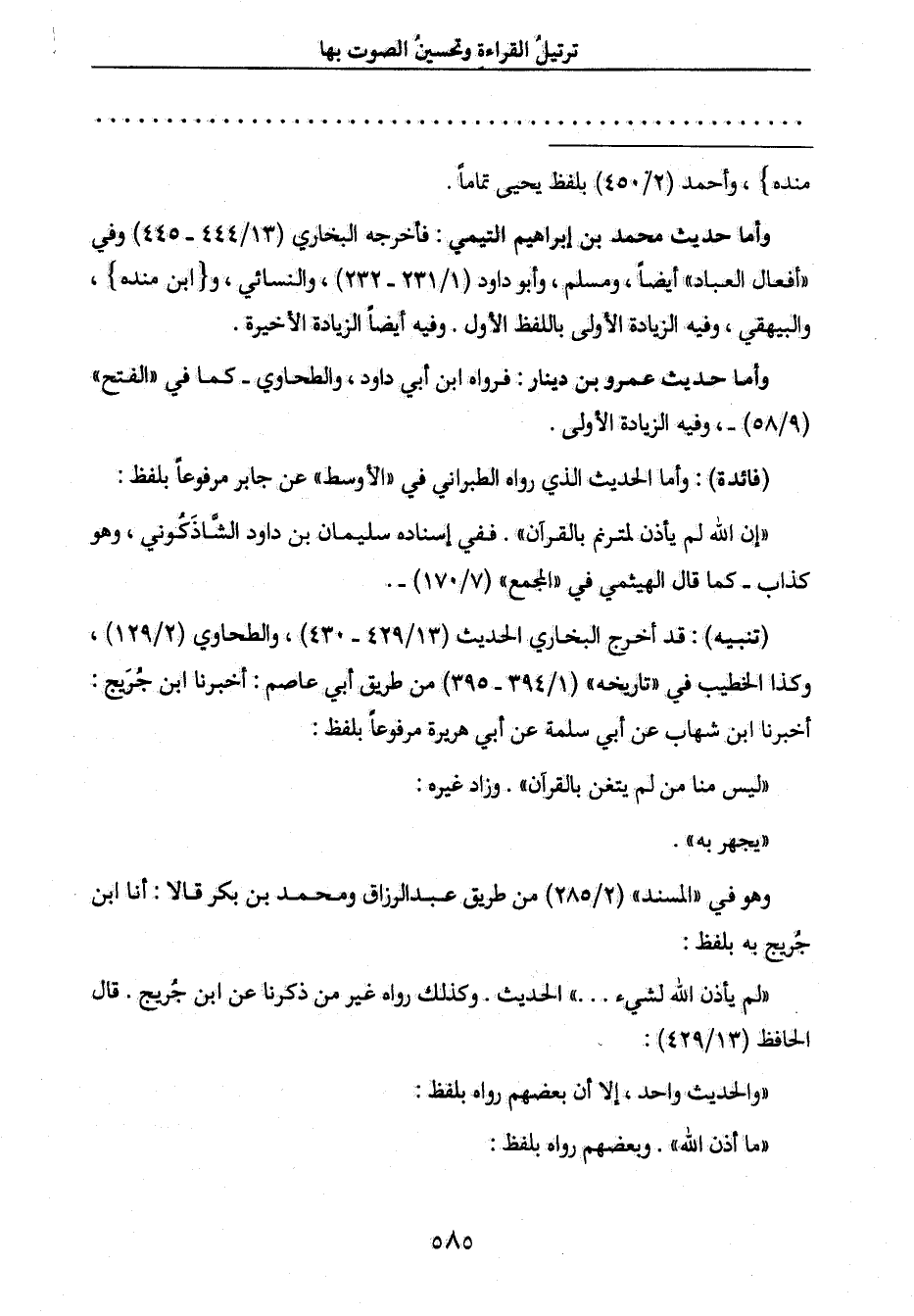 " إن الله لم يأذن لمترنم بالقرآن ". ففي إسناده سليمان بن داود الشَّاذَكُوني، وهو