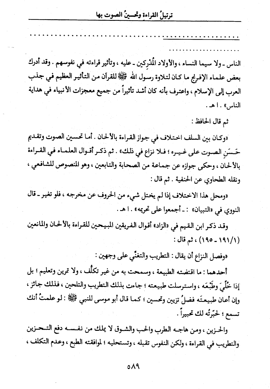 " وكان بين السلف اختلاف في جواز القراءة بالألحان. أما تحسين الصوت وتقديم