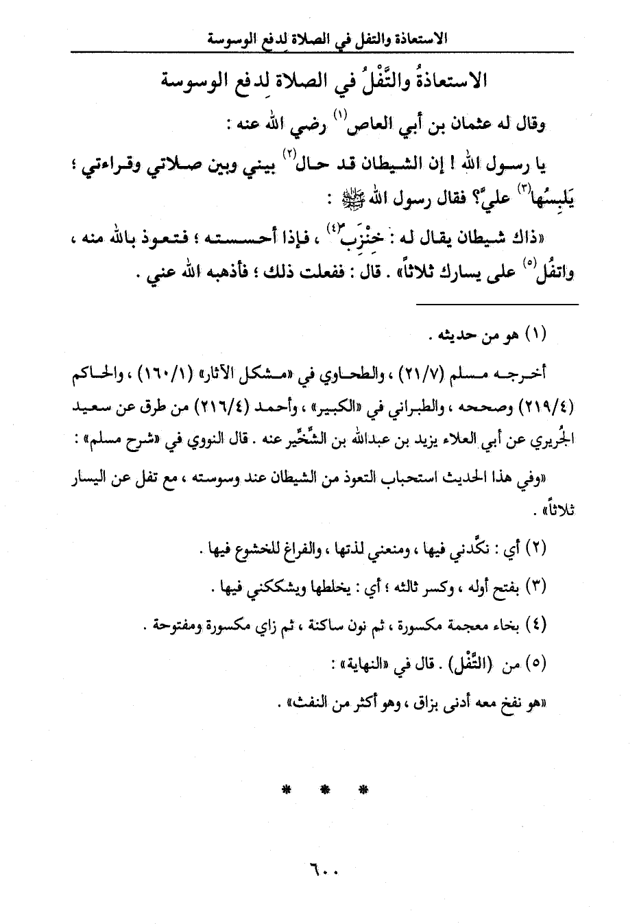 واتفُل (5) على يسارك ثلاثاً ". قال: ففعلت ذلك؛ فأذهبه الله عني.