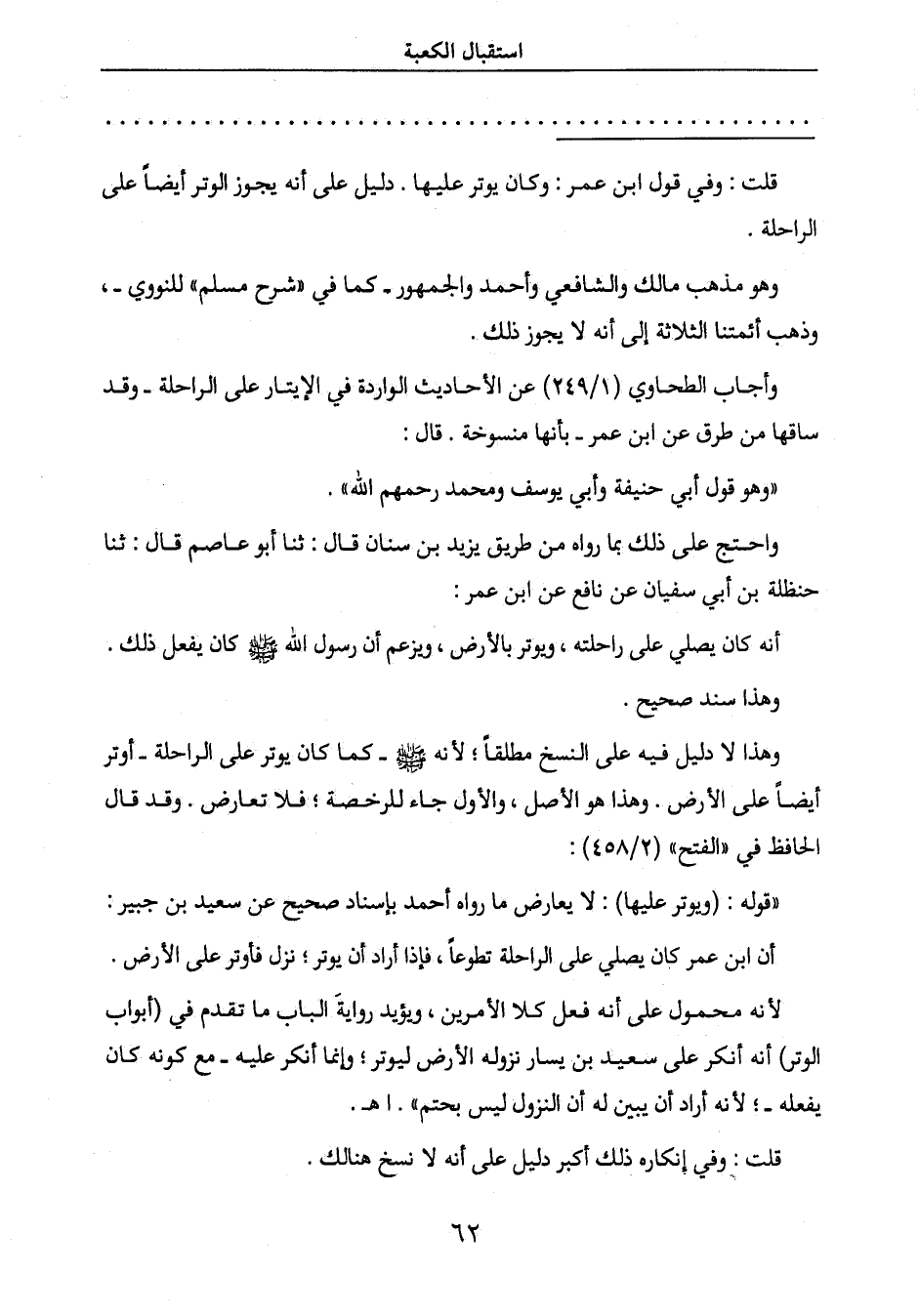 وهذا لا دليل فيه على النسخ مطلقاً؛ لأنه صَلَّى اللَّهُ عَلَيْهِ وَسَلَّمَ - كما كان يوتر على الراحلة - أوتر