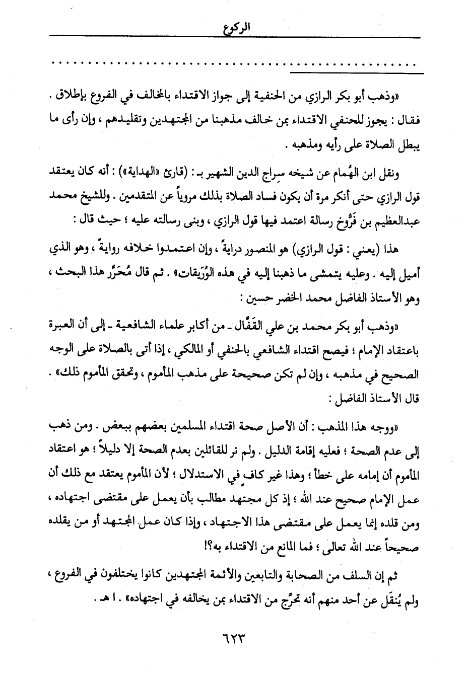 " وذهب أبو بكر الرازي من الحنفية إلى جواز الاقتداء بالمخالف في الفروع بإطلاق.