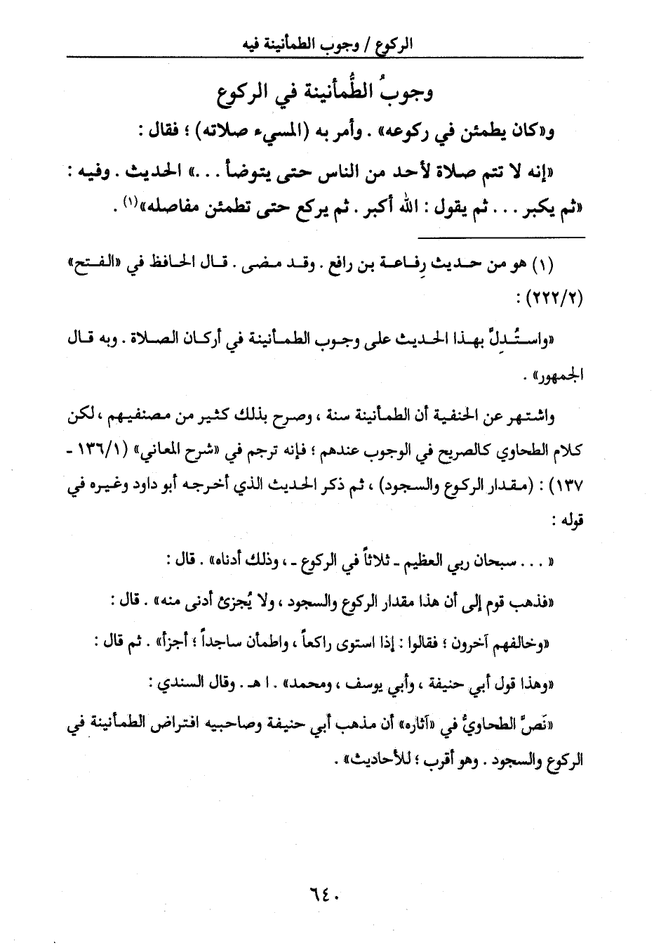 " نَصَّ الطحاويُّ في " آثاره " أن مذهب أبي حنيفة وصاحبيه افتراض الطمأنينة في
