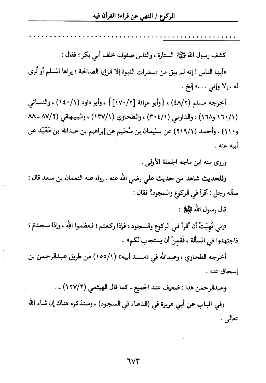 " إني نُهِيْتُ أن أقرأ في الركوع والسجود، فإذا ركعتم؛ فعظموا الله، وإذا سجدتم؛