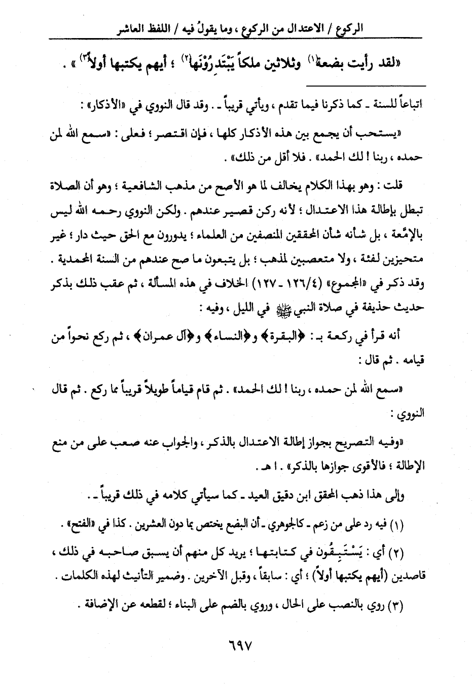 " وفيه التصريح بجواز إطالة الاعتدال بالذكر، والجواب عنه صعب على من منع