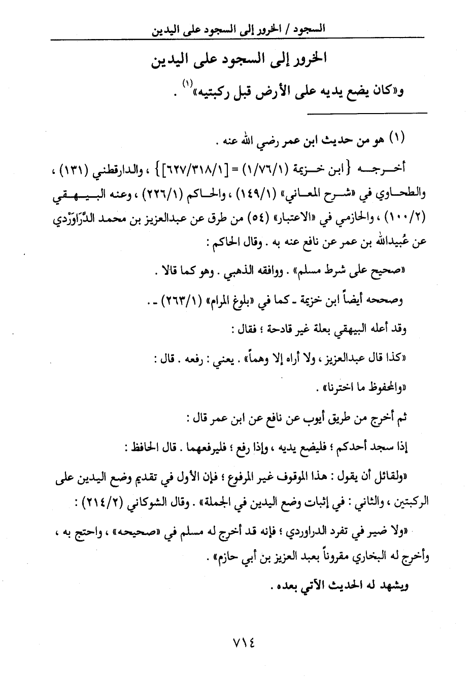الركبتين، والثاني: في إثبات وضع اليدين في الجملة ". وقال الشوكاني (2/214) :