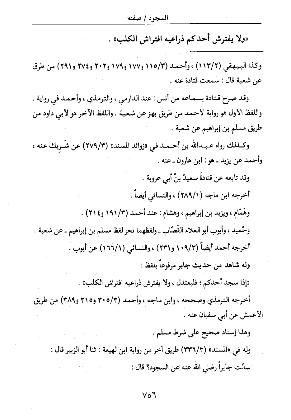 " ولا يفترش أحدكم ذراعيه افتراش الكلب ".