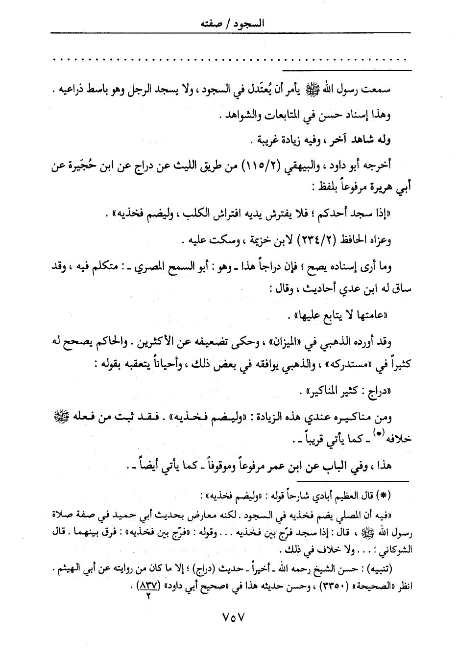 ومن مناكيره عندي هذه الزيادة: " وليضم فخذيه ". فقد ثبت من فعله صَلَّى اللَّهُ عَلَيْهِ وَسَلَّمَ