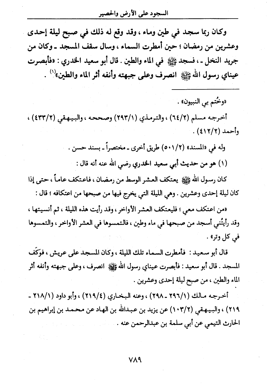 جريد النخل -، فسجد صَلَّى اللَّهُ عَلَيْهِ وَسَلَّمَ في الماء والطين. قال أبو سعيد الخدري: " فأبصرت