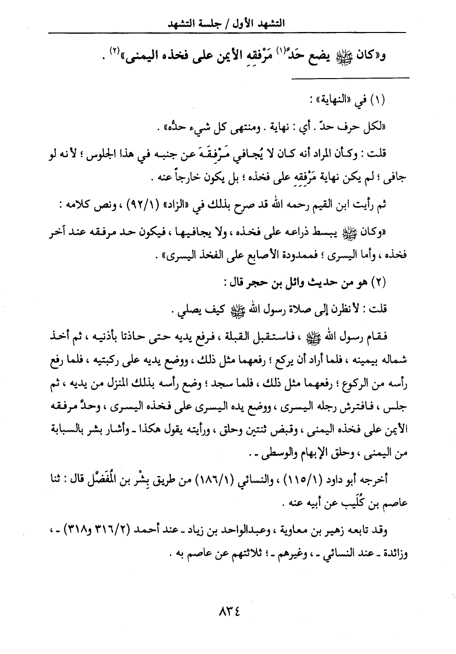 و " كان صَلَّى اللَّهُ عَلَيْهِ وَسَلَّمَ يضع حَدَّ (1) مَرْفقِهِ الأيمن على فخذه اليمنى " (2) .