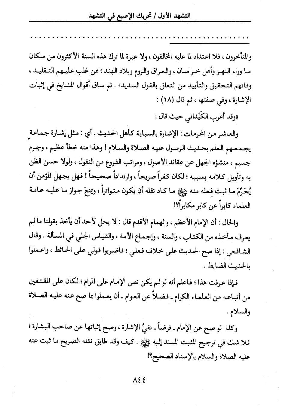 والعاشر من المحرمات: الإشارة بالسبابة كأهل الحديث. أي: مثل إشارة جماعةٍ