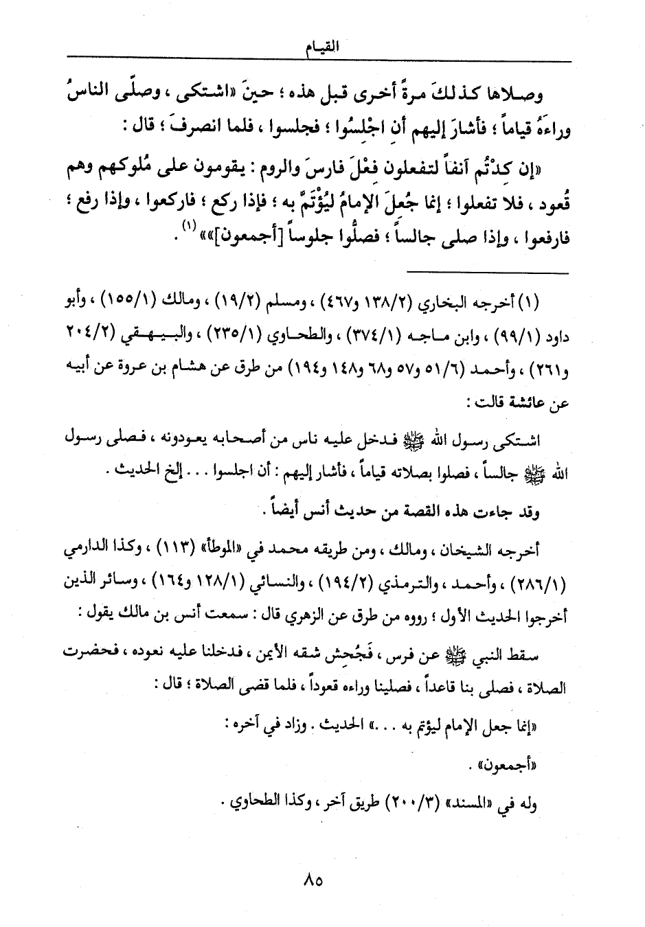 الله صَلَّى اللَّهُ عَلَيْهِ وَسَلَّمَ جالساً، فصلوا بصلاته قياماً، فأشار إليهم: أن اجلسوا ... إلخ الحديث.