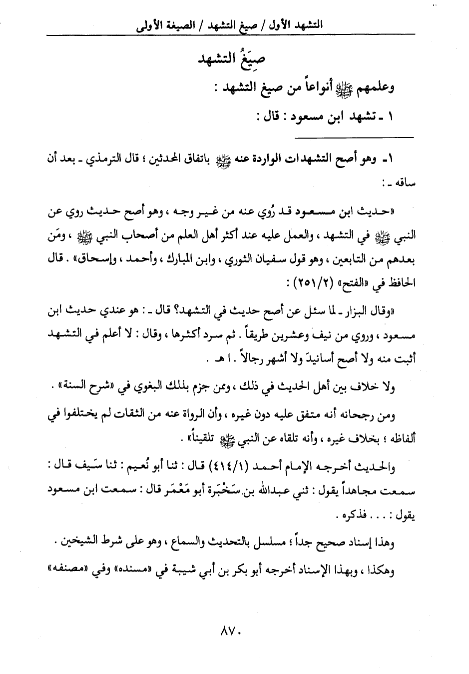 مسعود، وروي من نيف وعشرين طريقاً. ثم سرد أكثرها، وقال: لا أعلم في التشهد