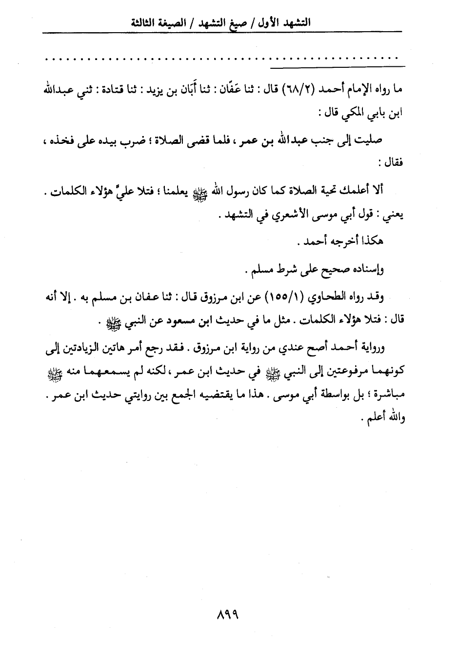 ألا أعلمك تحية الصلاة كما كان رسول الله صَلَّى اللَّهُ عَلَيْهِ وَسَلَّمَ يعلمنا؛ فتلا عليَّ هؤلاء الكلمات.
