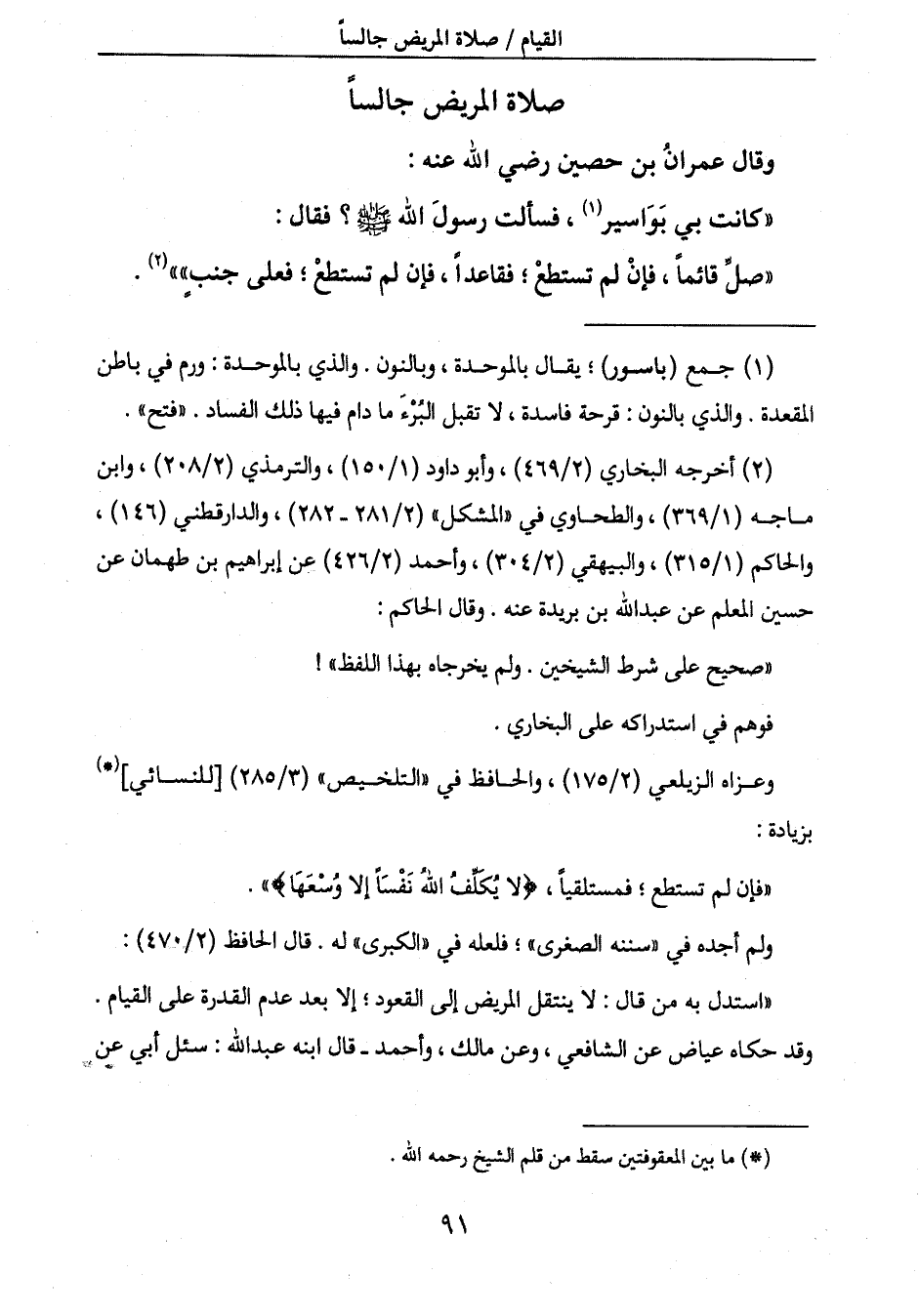 " صلِّ قائماً، فإنْ لم تستطعْ؛ فقاعداً، فإن لم تستطعْ؛ فعلى جنبٍ " " (2) .