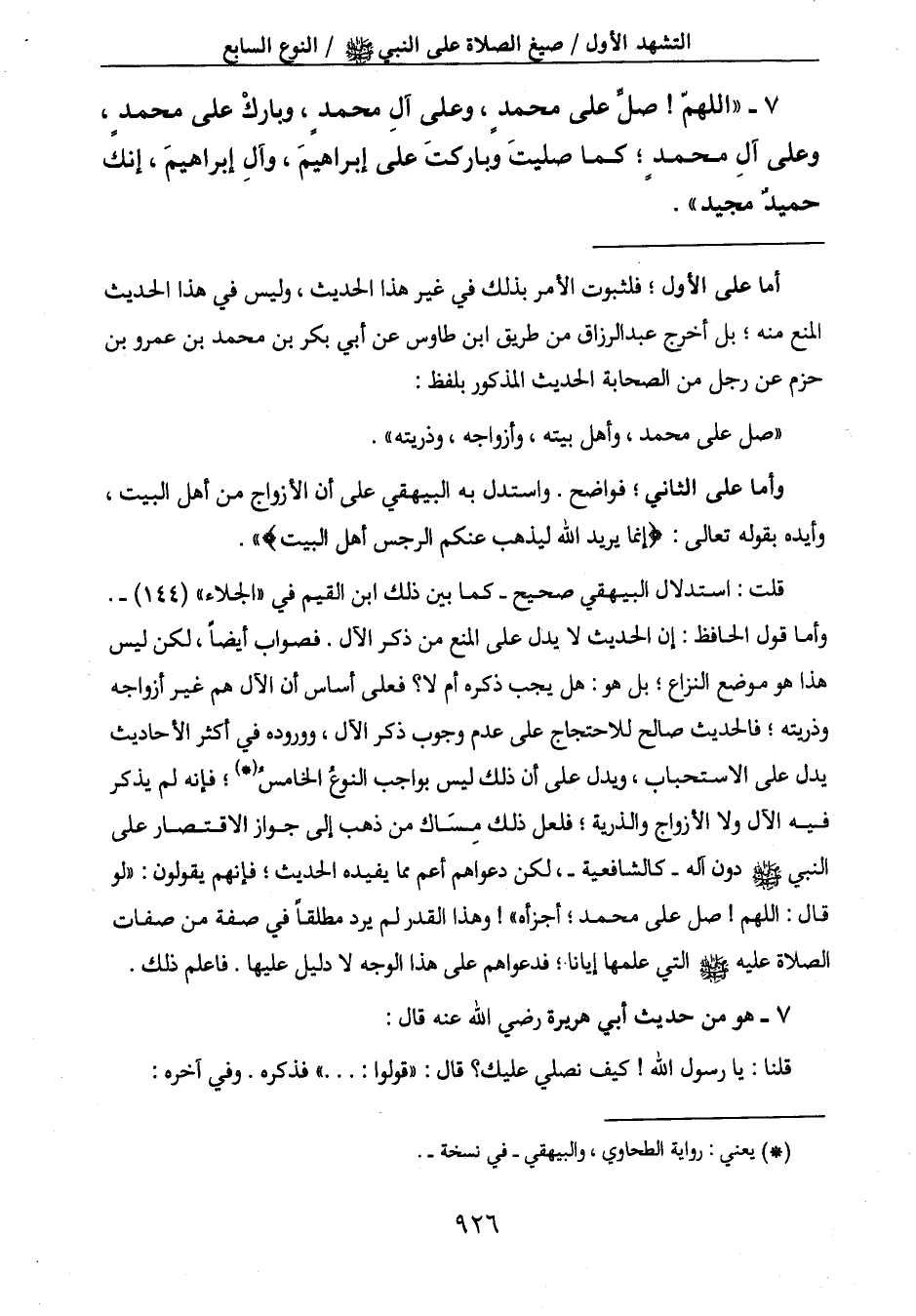 النبي صَلَّى اللَّهُ عَلَيْهِ وَسَلَّمَ دون آله - كالشافعية -، لكن دعواهم أعم مما يفيده الحديث؛ فإنهم يقولون: " لو