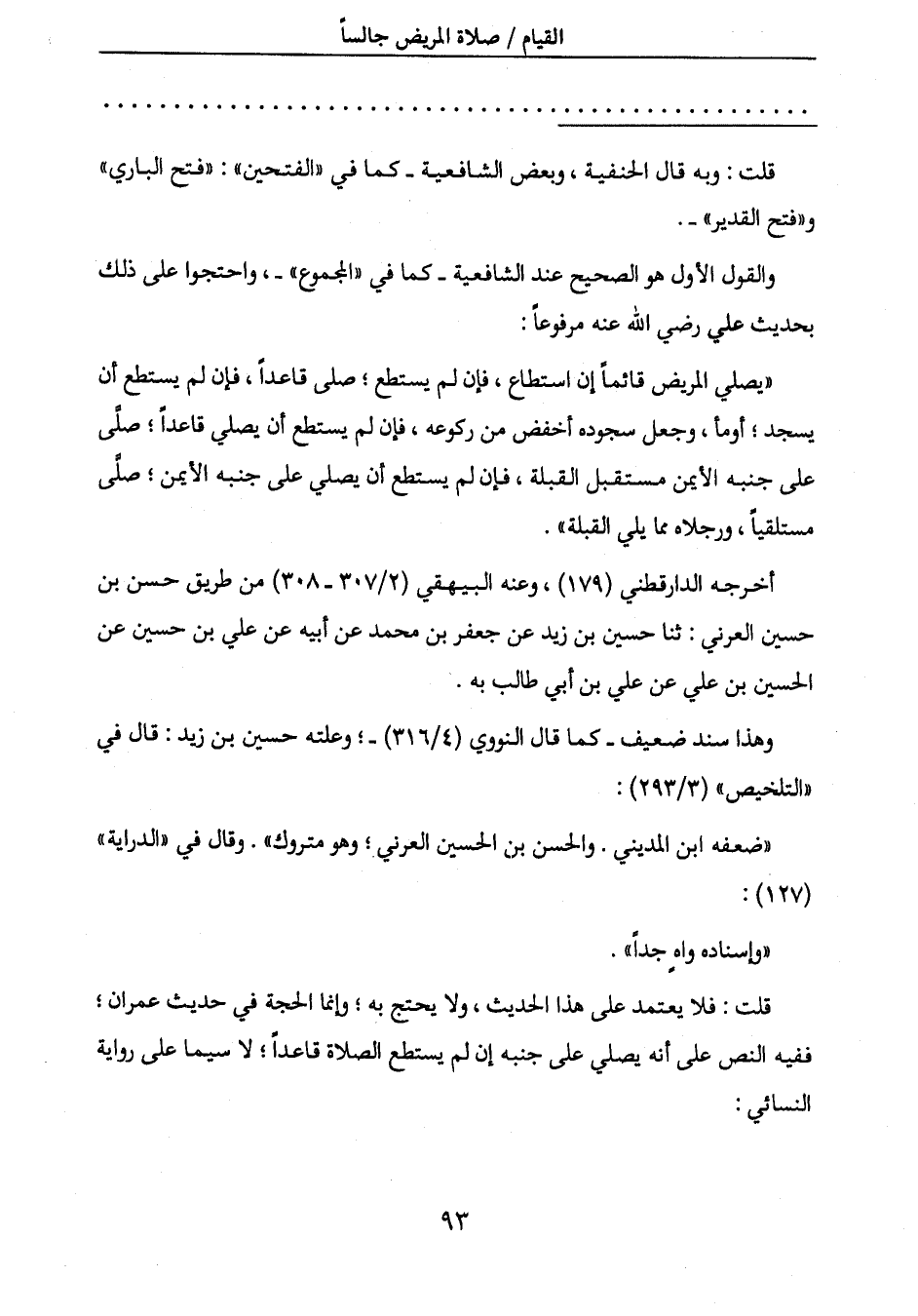 " يصلي المريض قائماً إن استطاع، فإن لم يستطع؛ صلَّى قاعداً، فإن لم يستطع أن