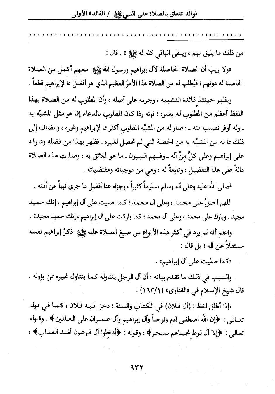 " ولا ريب أن الصلاة الحاصلة لآل إبراهيم ورسول الله صَلَّى اللَّهُ عَلَيْهِ وَسَلَّمَ معهم أكمل من الصلاة