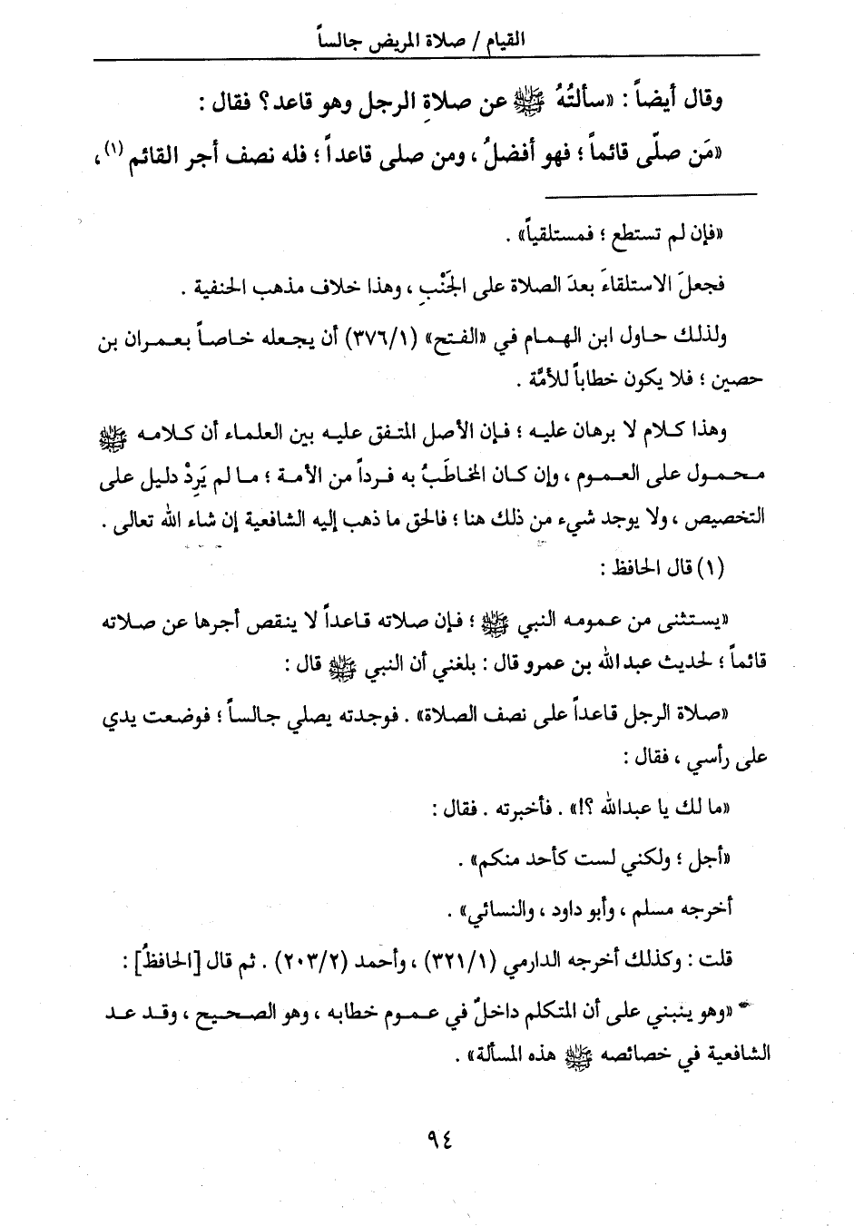 وقال أيضاً: " سألتُهُ صَلَّى اللَّهُ عَلَيْهِ وَسَلَّمَ عن صلاةِ الرجل وهو قاعد؟ فقال: