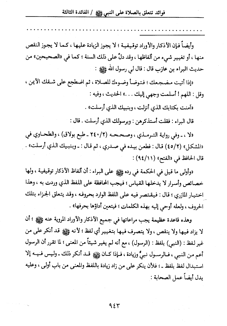 " وأولى ما قيل في الحكمة في رده صَلَّى اللَّهُ عَلَيْهِ وَسَلَّمَ على البراء: أن ألفاظ الأذكار توقيفية، ولها