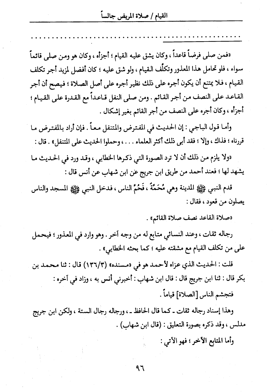 على من تكلف القيام مع مشقته عليه؛ كما بحثه الخطابي ".