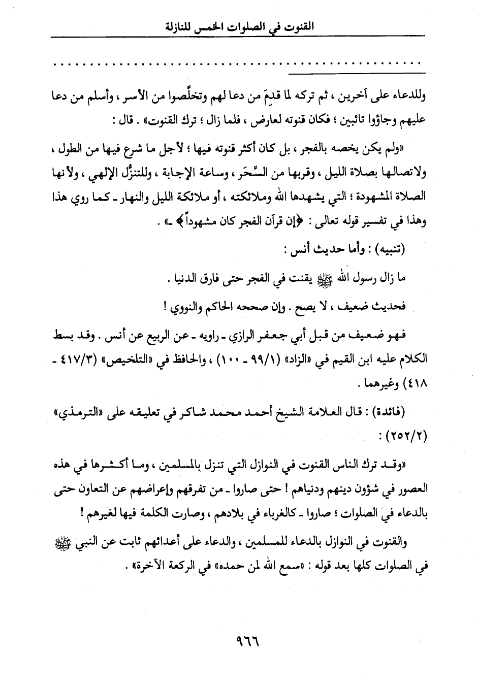 " وقد ترك الناس القنوت في النوازل التي تنزل بالمسلمين، وما أكثرها في هذه