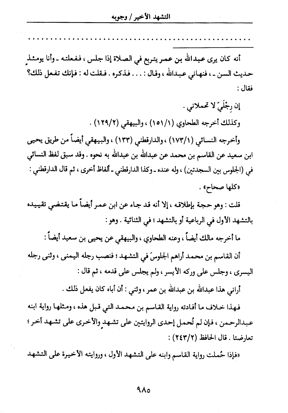 أن القاسم بن محمد أراهم الجلوسَ في التشهد؛ فنصب رجله اليمنى، وثنى رجله