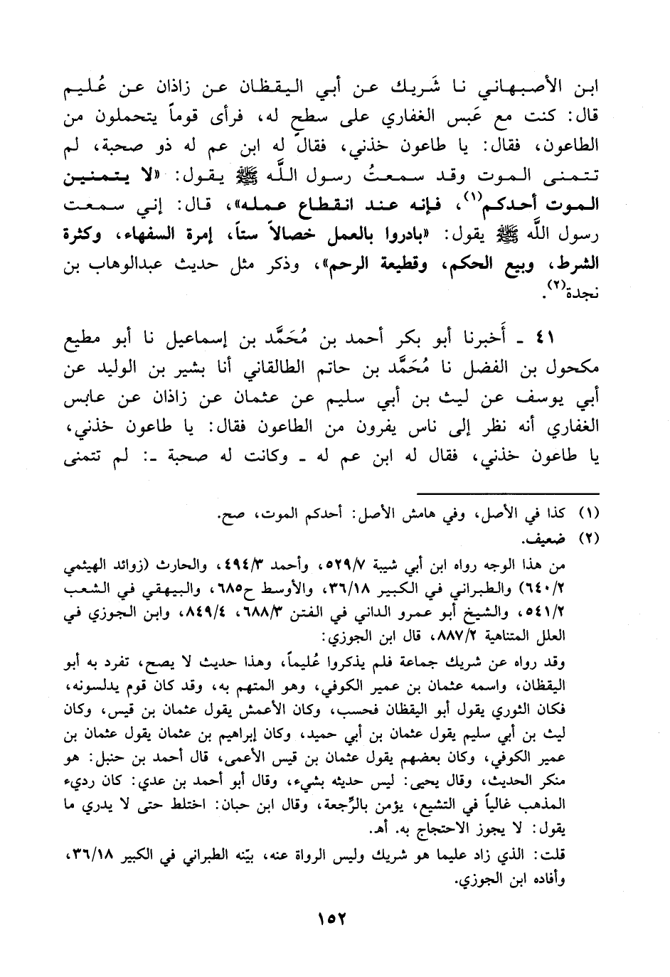 41- أخبرنا أبو بكر أحمد بن محمد بن إسماعيل، حَدَّثَنا أبو مطيع مكحول بن الفضل، حَدَّثَنا محمد بن حاتم الطالقاني، أخْبَرَنا بشير بن الوليد، عَن أبي يوسف عن ليث بن أبي سليم عن عثمان بن زاذان عن عابس الغفاري أنه نظر إلى ناس يفرون من الطاعون فقال: ياطاعون خذني ياطاعون خذني فقال له ابن عم له - وكانت له صحبة -: لم تتمنى -[153]- الموت وقد سمعت رسول الله صلى الله عليه وسلم يقول: لا يتمنى أحدكم الموت فإنه انقطاع عمله، ولاَ يرد فيستعتب فقال: إني أخاف ستا سمعت رسول الله صلى الله عليه وسلم يتخوفهن على أمته: إمارة السفهاء وكثرة الشرط وبيع الحكم وقطيعة الرحم والاستخفاف بالدم ونشأ يتخذون القرآن مزامير يقدمون أحدهم ليس بأفضلهم في الدين ولكن يقدمونه ليغنيهم به غناء.