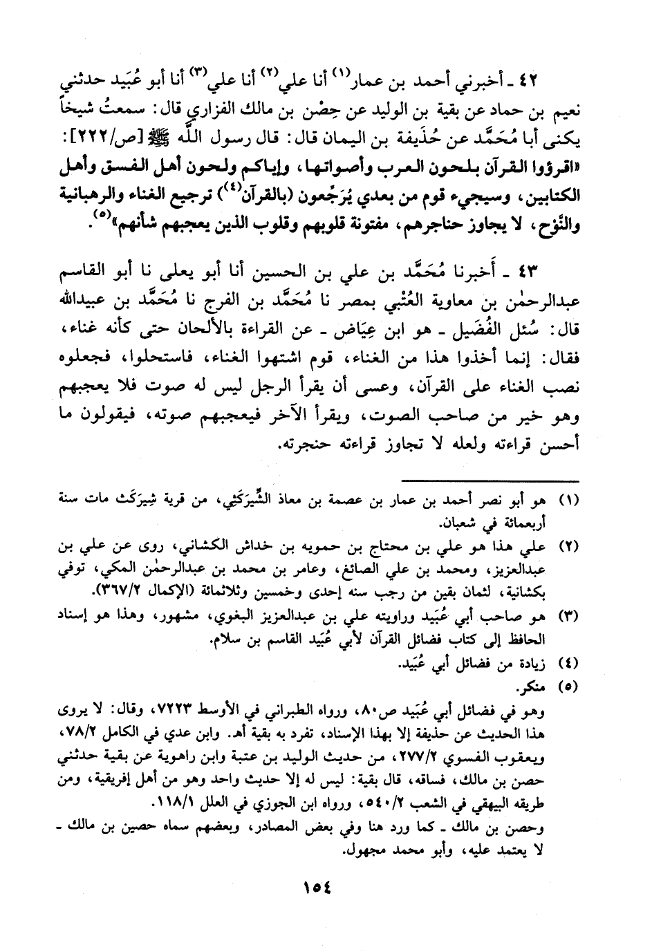 42- أخبرني أحمد بن عمار، أخْبَرَنا علي، أخْبَرَنا علي، أخْبَرَنا أبو عبيد حدثني نعيم بن حماد عن بقية بن الوليد عن حصن بن مالك الفزاري قال: سمعت شيخا يكنى أبا محمد عن حذيفة بن اليمان قال: قال رسول الله صلى الله عليه وسلم: اقرؤوا القرآن بلحون العرب وأصواتها وإياكم ولحون أهل الفسق وأهل الكتابين وسيجئ قوم من بعدي يرجعون بالقرآن ترجيع الغناء والرهبانية والنوح لا يجاوز حناجرهم مفتونة قلوبهم وقلوب الذين يعجبهم شأنهم.