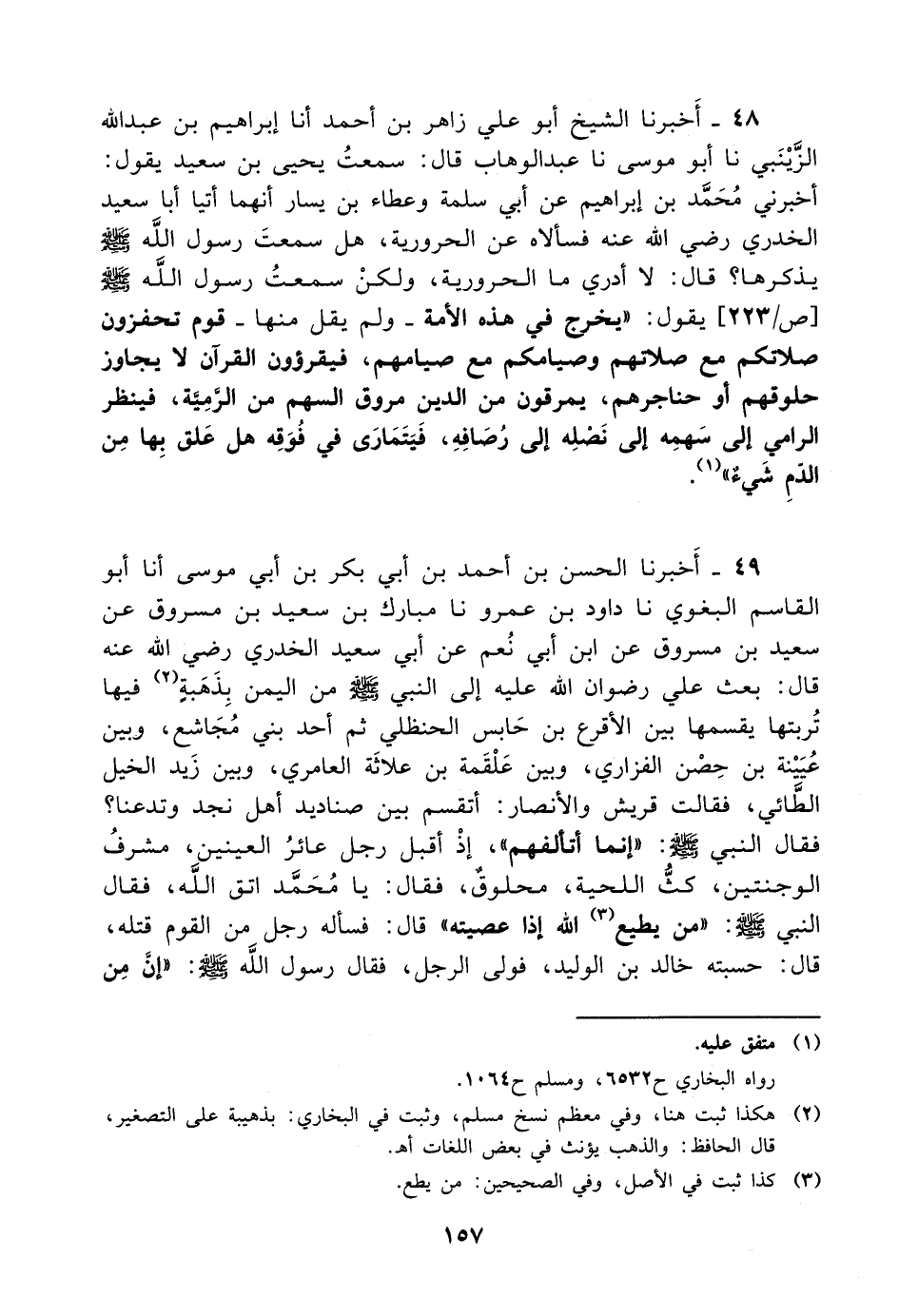 49- أخبرنا الحسن بن أحمد بن أبي بكر بن أبي موسى، أخْبَرَنا أبو القاسم البغوي، حَدَّثَنا داود بن عمرو، حَدَّثَنا مبارك بن سعيد بن مسروق عن سعيد بن مسروق عن ابن أبي نعم، عَن أبي سعيد الخدري رضي الله عنه قال: بعث علي رضوان الله عليه إلى النبي صلى الله عليه وسلم من اليمن بذهبه فيها تربتها يقسمها بين الأقرع بن حابس الحنظلي ثم أحد بني مجاشع وبين عيينة بن حصن الفزاري وبين علقمة بن علاثة العامري وبين زيد الخيل الطائي فقالت قريش والأنصار: أتقسم بين صناديد أهل نجد وتدعنا؟ فقال النبي صلى الله عليه وسلم: إنما أتألفهم إذ أقبل رجل عائر العينين مشرف الوجنتين كث اللحية محلوق فقال: يامحمد اتق الله فقال النبي صلى الله عليه وسلم: من يطيع الله إذا عصيته قال: فسأله رجل من القوم قتله قال: حسبته خالد بن الوليد فولى الرجل فقال رسول الله صلى الله عليه وسلم: إن من -[158]- ضئضئي هذا قوم يقرؤون القرآن لا يجاوز حناجرهم يقتلون أهل الإسلام ويدعون أهل الأوثان يمرقون من الإسلام كما يمرق السهم من الرمية لئن أدركتهم لأقتلنهم قتل عاد.
