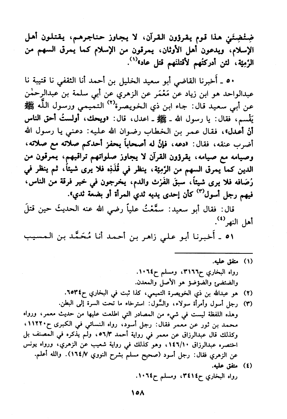50- أخبرنا القاضي أبو سعيد الخليل بن أحمد، أخْبَرَنا الثقفي، حَدَّثَنا قتيبة، حَدَّثَنا عبد الواحد هو ابن زياد عن معمر عن الزهري، عَن أبي سلمة بن عبد الرحمن، عَن أبي سعيد قال: جاء ابن ذي الخويصرة التميمي ورسول الله صلى الله عليه وسلم يقسم فقال: يا رسول الله صلى الله عليه وسلم اعدل قال: ويحك أولست أحق الناس أن أعدل فقال عمر بن الخطاب رضوان الله عليه: دعني يا رسول الله أضرب عنقه فقال: دعه فإن له أصحابا يحفز أحدكم صلاته مع صلاته وصيامه مع صيامه يقرؤون القرآن لا يجاوز صلواتهم تراقيهم يمرقون من الدين كما يمرق السهم من الرمية ينظر في قذذه فلا يرى شيئا ثم ينظر في رصافه فلا يرى شيئا سبق الفرث والدم يخرجون في خير فرقة من الناس فيهم رجل أسول كأن إحدى يديه ثدي المرأة أو بضعة ثدي.
