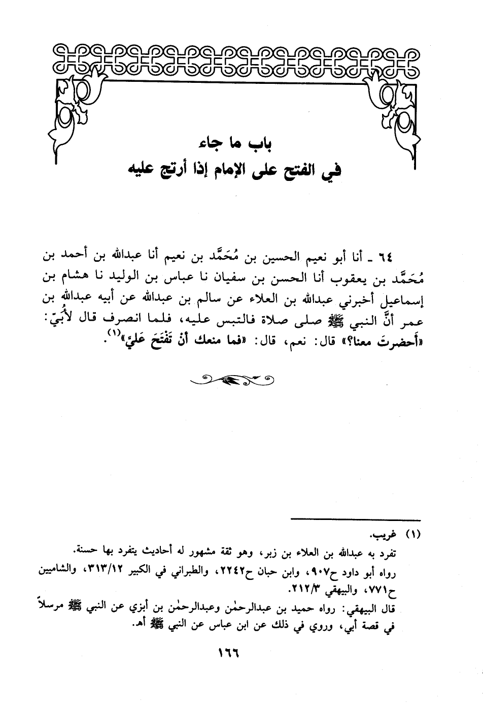 64-، أخْبَرَنا أبو نعيم الحسين بن محمد بن نعيم، أخْبَرَنا عبد الله بن أحمد بن محمد بن يعقوب، أخْبَرَنا الحسن بن سفيان، حَدَّثَنا عباس بن الوليد، حَدَّثَنا هشام بن إسماعيل أخبرني عبد الله بن العلاء عن سالم بن عبد الله عن أبيه عبد الله بن عمر أن النبي صلى الله عليه وسلم صلى صلاة فالتبس عليه فلما انصرف قال لأبي: أحضرت معنا؟ قال: نعم قال: فما منعك أن تفتح علي.