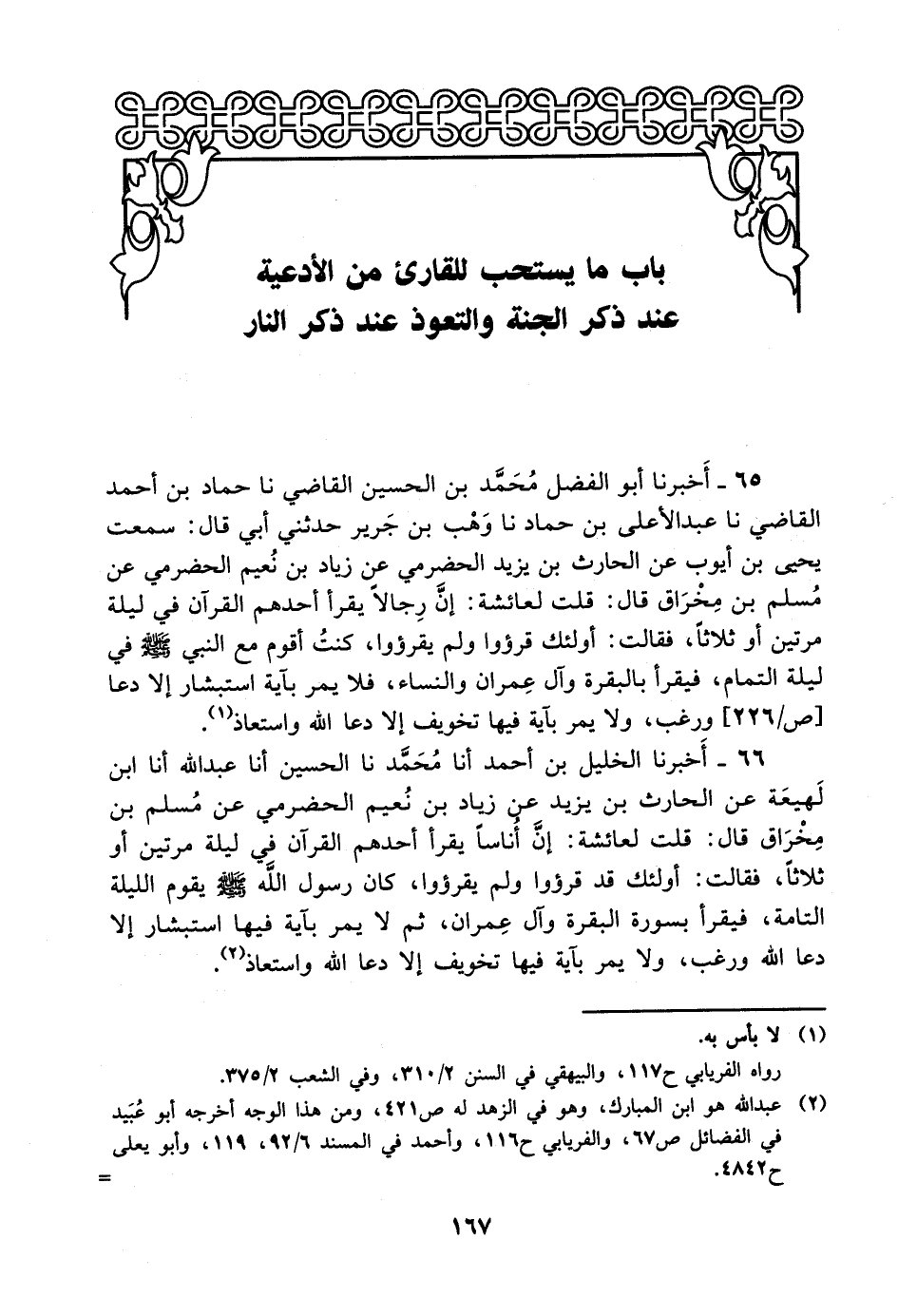66- أخبرنا الخليل بن أحمد، أخْبَرَنا محمد، حَدَّثَنا الحسين، أخْبَرَنا عبد الله، أخْبَرَنا ابن لهيعة عن الحارث بن يزيد عن زياد بن نعيم الحضرمي عن مسلم بن مخراق قال: قلت لعائشة: إن أناسا يقرأ أحدهم القرآن في ليلة مرتين أو ثلاثا فقالت: أولئك قد قرؤوا ولم يقرؤوا كان رسول الله صلى الله عليه وسلم يقوم الليلة التامة فيقرأ بسورة البقرة وآل عمران ثم لا يمر بآية فيها استبشار إلا دعا الله ورغب، ولاَ يمر بآية فيها تخويف إلا دعا الله واستعاذ.