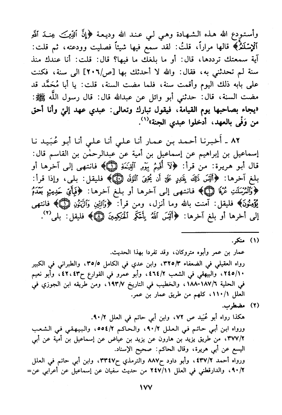 82- أخبرنا أحمد بن عمار، أخْبَرَنا علي، أخْبَرَنا علي، أخْبَرَنا أبو عبيد، حَدَّثَنا إسماعيل بن إبراهيم عن إسماعيل بن أمية، عَن عَبد الرحمن بن القاسم قال: قال أبو هريرة: من قرأ {لا أقسم بيوم القيامة} فانتهى إلى آخرها أو بلغ آخرها {أليس ذلك بقادر على أن يحيى الموتى} فليقل: بلى وإذا قرأ {والمرسلات عرفا} فانتهى إلى آخرها أو بلغ آخرها {فبأي حديث بعده يؤمنون} فليقل: آمنت بالله وما أنزل، وَمن قرأ {والتين والزيتون} فانتهى إلى أخرها أو بلغ آخرها {أليس الله بأحكم الحاكمين} فليقل: بلى.