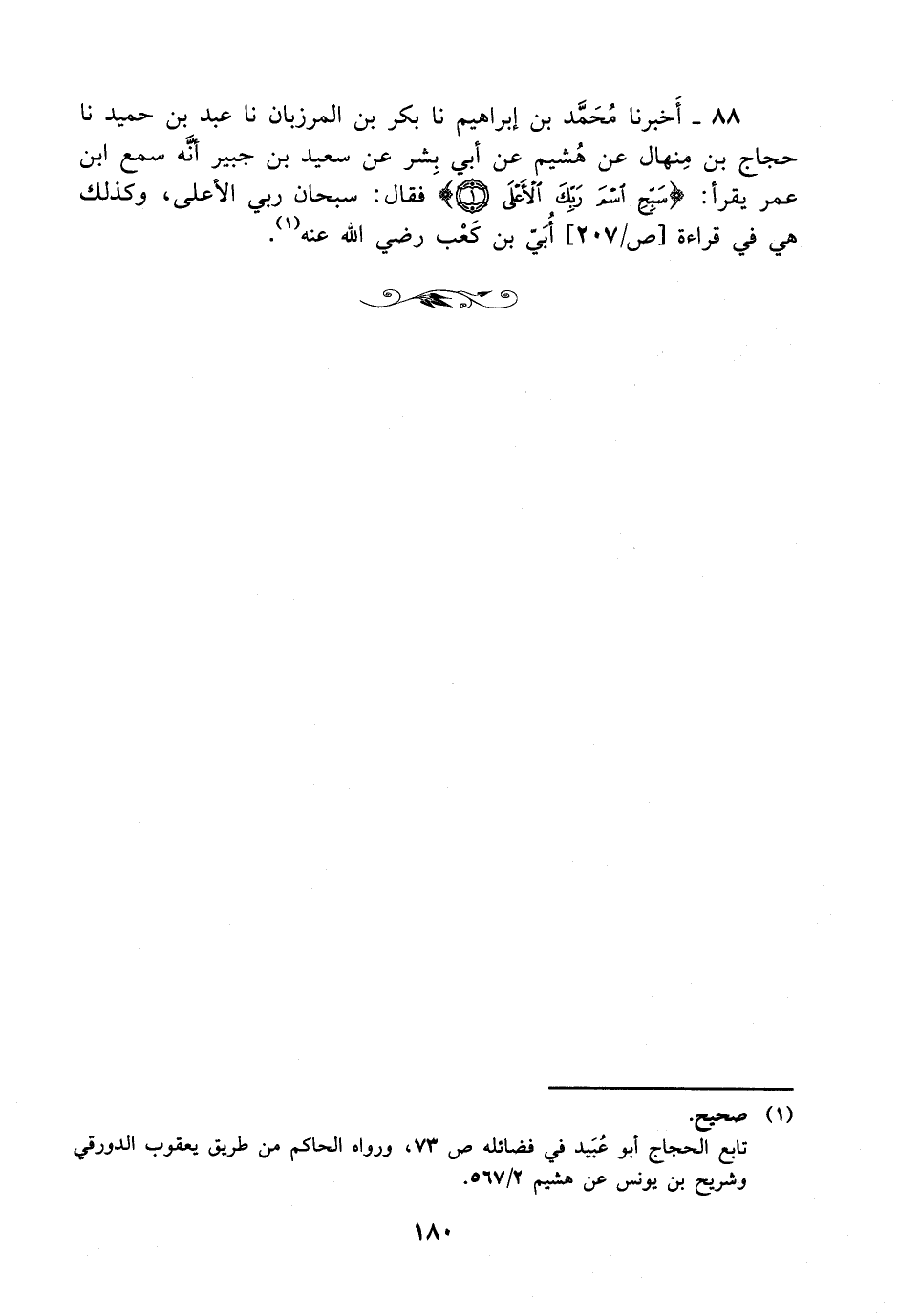 88- أخبرنا محمد بن إبراهيم، حَدَّثَنا بكر بن المرزبان، حَدَّثَنا عبد بن حميد، حَدَّثَنا حجاج بن منهال عن هشيم، عَن أبي بشر عن سعيد بن جبير أنه سمع ابن عمر يقرأ {سبح اسم ربك الأعلى} فقال: سبحان ربي الأعلى وكذلك هي في قراءة أبي بن كعب رضي الله عنه.