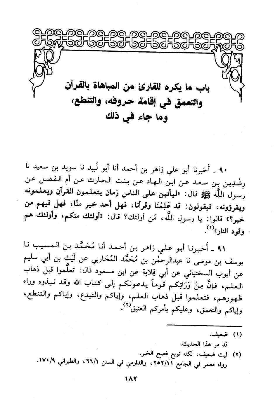 91- أخبرنا أبو علي زاهر بن أحمد، أخْبَرَنا محمد بن المسيب، حَدَّثَنا يوسف بن موسى، حَدَّثَنا عبد الرحمن بن محمد المحاربي عن ليث بن أبي سليم عن أيوب السختياني، عَن أبي قلابة عن ابن مسعود قال: تعلموا قبل ذهاب العلم فإن من ورائكم قوما يدعونكم إلى كتاب الله وقد نبذوه وراء ظهورهم فتعلموا قبل ذهاب العلم وإياكم والتبدع وإياكم والتنطع وإياكم والتعمق وعليكم بأمركم العتيق.
