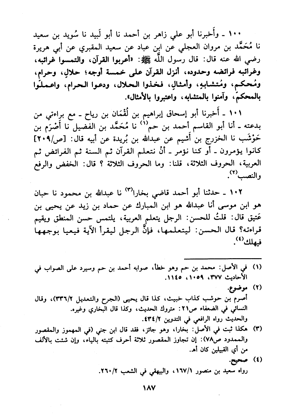 100- وأخبرنا أبو علي زاهر بن أحمد، حَدَّثَنا أبو لبيد، حَدَّثَنا سويد بن سعيد، حَدَّثَنا محمد بن مروان العجلي عن ابن عباد عن سعيد المقبري، عَن أبي هريرة رضي الله عنه قال: قال رسول الله صلى الله عليه وسلم: أعربوا القرآن والتمسوا غرائبه وغرائبه فرائضه وحدوده أنزل القرآن على خمسة أوجه حلال وحرام ومحكم ومتشابه وأمثال فخذوا الحلال ودعوا الحرام واعملوا بالمحكم وآمنوا بالمتشابه واعتبروا بالأمثال.