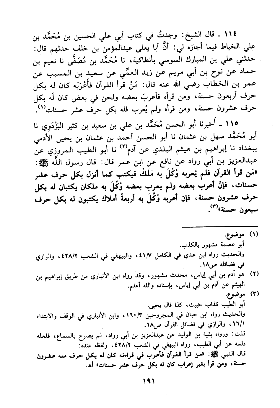 115- أخبرنا أبو الحسن محمد بن علي بن سعيد بن كثير البزدوي، حَدَّثَنا أبو محمد سهل بن عثمان، حَدَّثَنا أبو الحسن أحمد بن عثمان بن يحيى الأدمي ببغداد، حَدَّثَنا إبراهيم بن هيثم البلدي عن آدم، حَدَّثَنا أبو الطيب المروزي، عَن عَبد العزيز بن أبي رواد عن نافع عن ابن عمر قال: قال رسول الله صلى الله عليه وسلم: من قرأ القرآن فلم يعربه وكل به ملك فيكتب كما أنزل بكل حرف عشر حسنات فإن أعرب بعضه ولم يعرب بعضه وكل به ملكان يكتبان له بكل حرف عشرون حسنة فإن أعربه وكل به أربعة أملاك يكتبون له بكل حرف سبعون حسنة.
