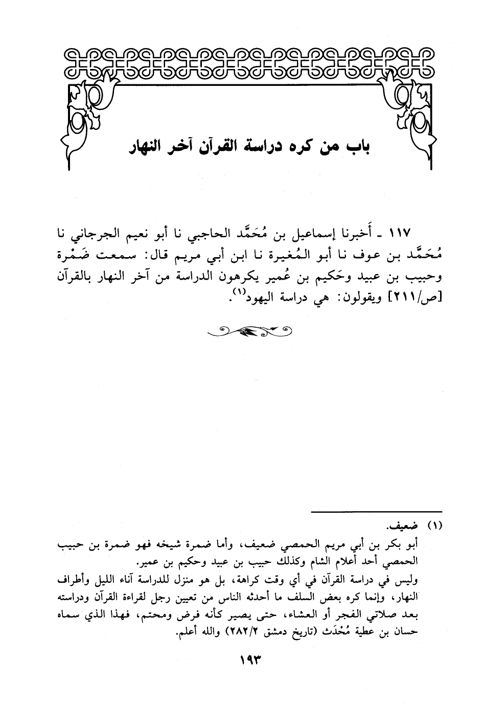 117- أخبرنا إسماعيل بن محمد الحاجبي نا أبو نعيم الجرجاني، حَدَّثَنا محمد بن عوف، حَدَّثَنا أبو المغيرة، حَدَّثَنا ابن أبي مريم قال: سمعت ضمرة وحبيب بن عبيد وحكيم بن عمير يكرهون الدراسة من آخر النهار بالقرآن ويقولون: هي دراسة اليهود.