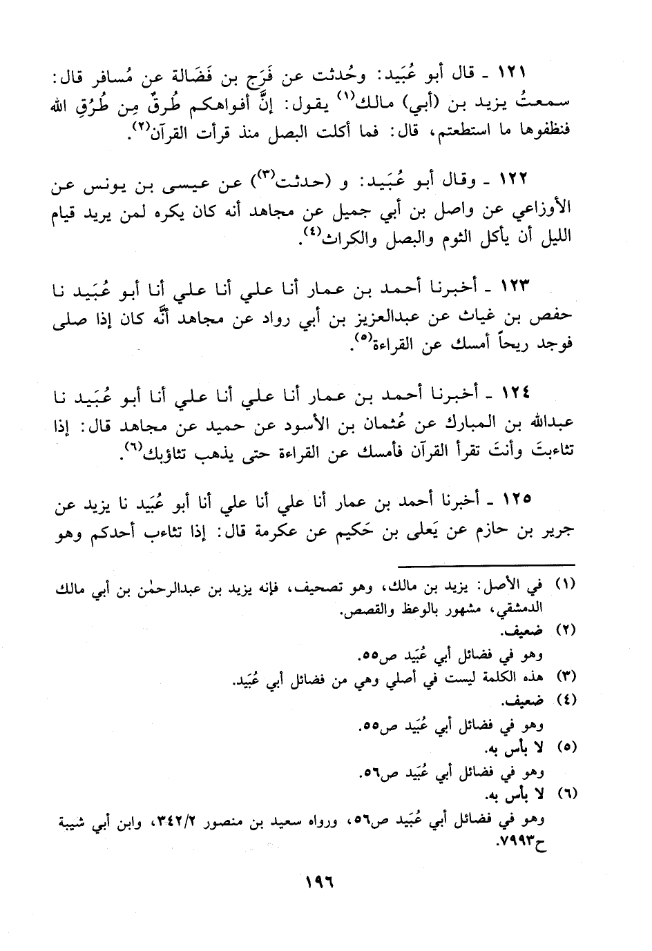 121- قال أبو عبيد: وحدثت عن فرج بن فضالة عن مسافر قال: سمعت يزيد بن أبي مالك يقول: إن أفواهكم طرق من طرق الله فنظفوها ما استطعتم قال: فما أكلت البصل منذ قرأت القرآن.