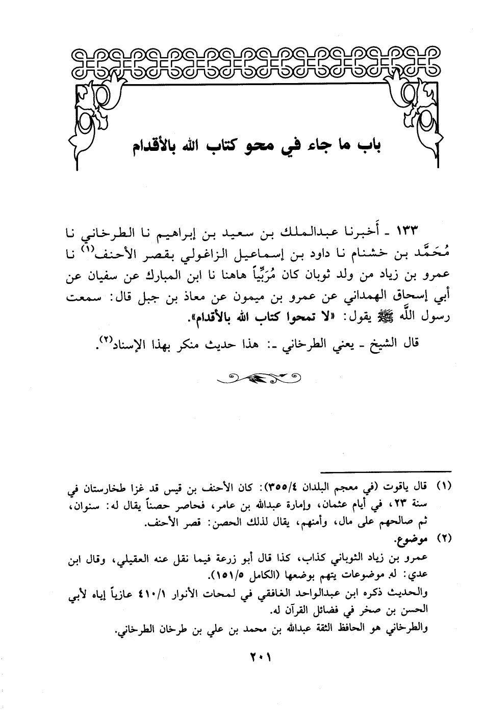 133- أخبرنا عبد الملك بن سعيد بن إبراهيم، حَدَّثَنا الطرخاني، حَدَّثَنا محمد بن خشنام، حَدَّثَنا داود بن إسماعيل الزاغولي بقصر الأحنف، حَدَّثَنا عمرو بن زياد من ولد ثوبان كان مربيا هاهنا، حَدَّثَنا ابن المبارك عن سفيان، عَن أبي إسحاق الهمداني عن عمرو بن ميمون عن معاذ بن جبل قال: سمعت رسول الله صلى الله عليه وسلم يقول: لا تمحوا كتاب الله بالأقدام.