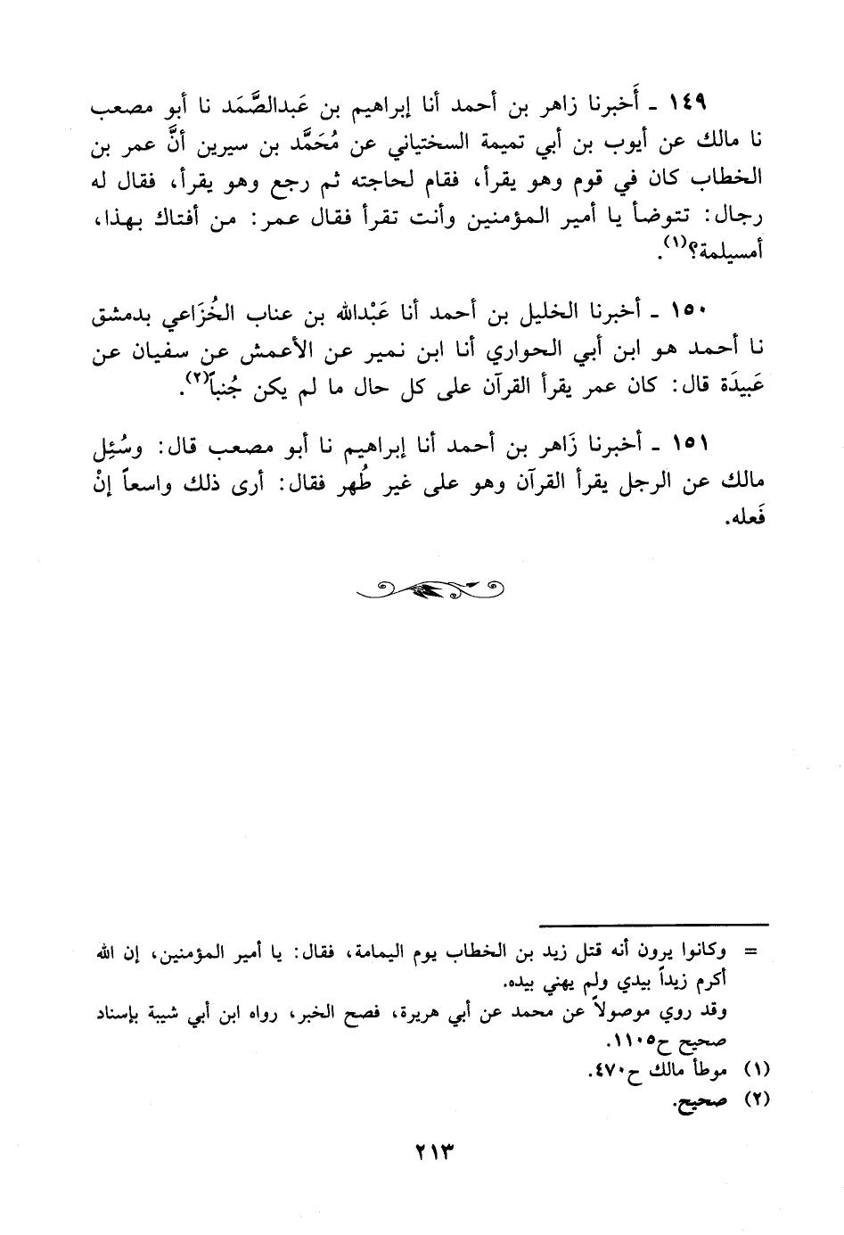 149- أخبرنا زاهر بن أحمد، أخْبَرَنا إبراهيم بن عبد الصمد، حَدَّثَنا أبو مصعب، حَدَّثَنا مالك عن أيوب بن أبي تميمة السختياني عن محمد بن سيرين أن عمر بن الخطاب كان في قوم وهو يقرأ فقام لحاجته ثم رجع وهو يقرأ فقال له رجال: تتوضأ ياأمير المؤمنين وأنت تقرأ فقال عمر: من أفتاك بهذا أمسيلمة؟.