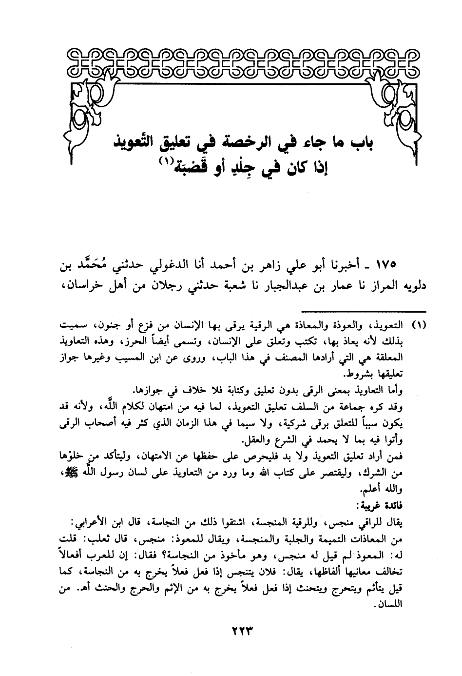175- أخبرنا أبو علي زاهر بن أحمد، أخْبَرَنا الدغولي حدثني محمد بن دلويه المراز، حَدَّثَنا عمار بن عبد الجبار، حَدَّثَنا شعبة حدثني رجلان من أهل خراسان -[224]- أحدهما يقال له: أبو عصمة والآخر عيسى أنهما سمعا رجلا من أهل مكة أو المدينة يقول: سألت ابن المسيب عن التعويذ فقال: إذا كان في أديم أو نحوه فلا بأس به.