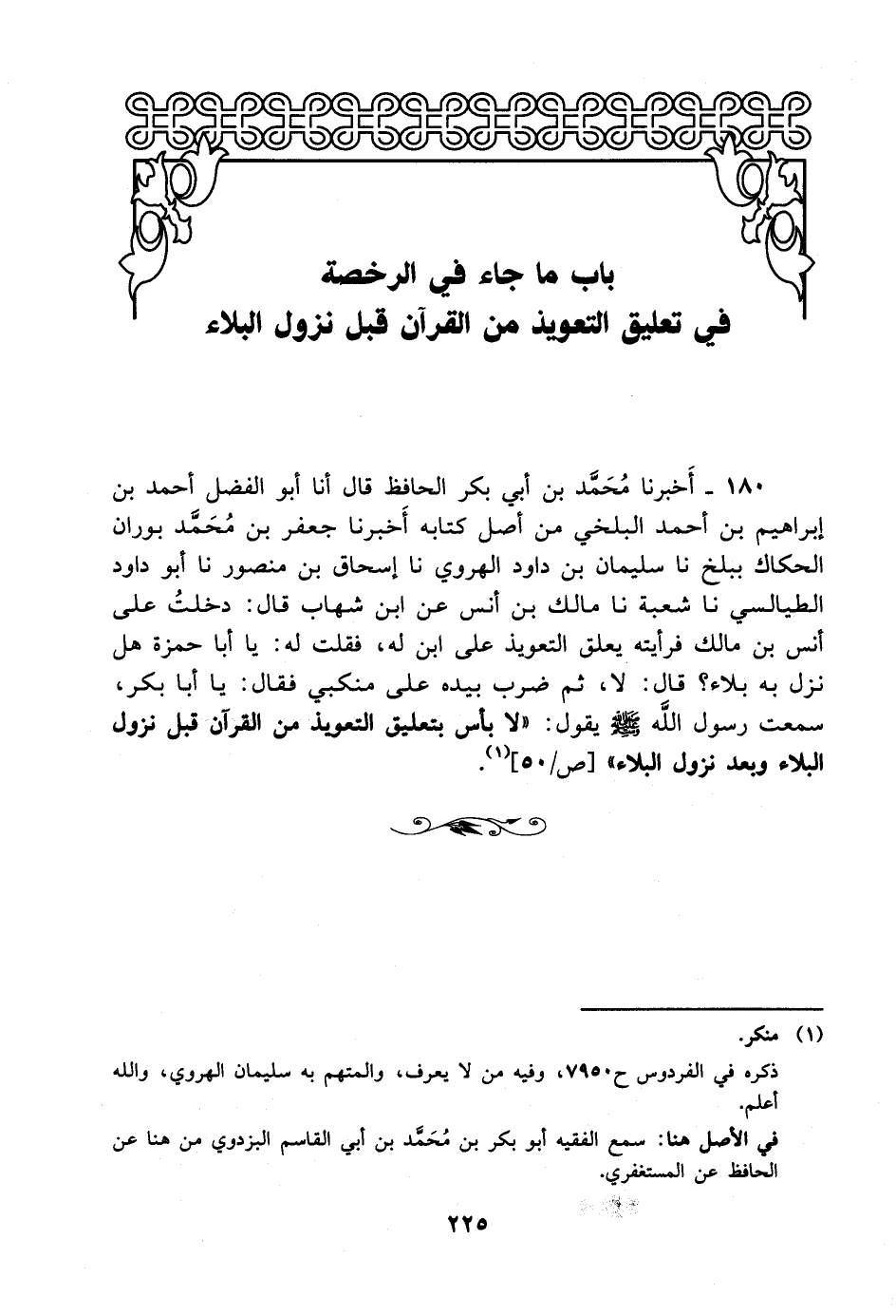 180- أخبرنا محمد بن أبي بكر الحافظ قال، أخْبَرَنا أبو الفضل أحمد بن إبراهيم بن أحمد البلخي من أصل كتابه أخبرنا جعفر بن محمد بوران الحكاك ببلخ، حَدَّثَنا سليمان بن داود الهروي، حَدَّثَنا إسحاق بن منصور، حَدَّثَنا أبو داود الطيالسي، حَدَّثَنا شعبة، حَدَّثَنا مالك بن أنس عن ابن شهاب قال: دخلت على أنس بن مالك فرأيته يعلق التعويذ على ابن له فقلت له: ياأبا حمزة هل نزل به بلاء؟ قال: لا ثم ضرب بيده على منكبي فقال: يا أبا بكر سمعت رسول الله صلى الله عليه وسلم يقول: لا بأس بتعليق التعويذ من القرآن قبل نزول البلاء وبعد نزول البلاء.